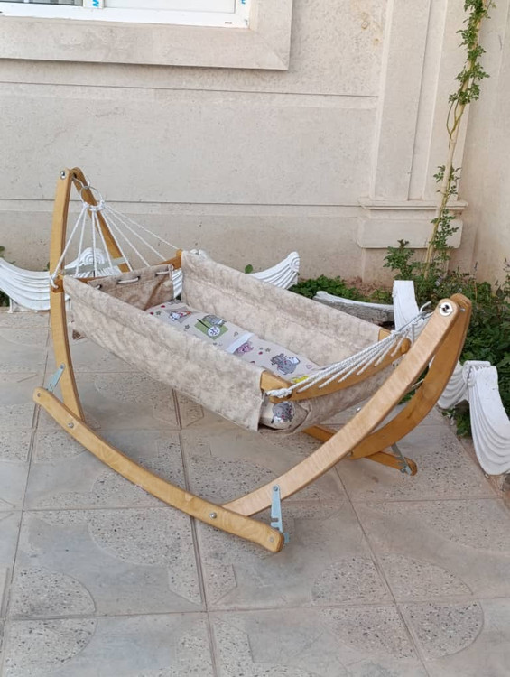 جنس پارچه تترون جنس چوب پلی وود چند لایه ،گهواره دارای تشک و بالشت و کاور برای حمل آسان ،پایه شیب قابل تنظیم دارد و تاشوست